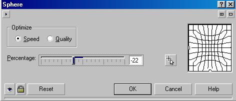 Похожий эффект (Рис. 18.6, справа) достигается с помощью команды Sphere (Сфера). В диалоге настройки сферического искривления (Рис. 18.9) вы также можете задать степень искривления с помощью ползунка. Кроме того, установив переключатель Optimize (Оптимизировать) в положение Quality (Качество), вы получите высококачественное изображение, но преобразование будет выполняться достаточно долго. Установив переключатель в положение Speed (Скорость), вы ускорите преобразование, немного потеряв в качестве.