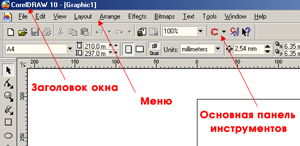 Если у вас установлено меньшее разрешение, измените его. Познакомимся теперь с основными элементами рабочего окна редактора векторной графики CorelDRAW 10 (Рис. 2.3). Как и в любой другой программе, работающей в среде Windows, в верхней части окна расположены заголовок окна и меню. Остальные элементы характерны для CorelDRAW 10. Внешний вид рабочего окна у вас может несколько отличаться от нашего, так как CorelDRAW 10 предоставляет пользователю достаточно большие возможности по изменению интерфейса.