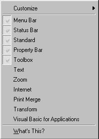 В центре окна программы расположен рисунок листа бумаги, называемый рабочей областью. Вы можете рисовать как внутри рабочей области, так и вне ее, но при выводе на печать будет напечатано только то, что находится внутри рабочей области. Полосы прокрутки позволяют передвигаться по изображению, а измерительные линейки - точно позиционировать элементы рисунка и измерять их размеры. Для работы с цветом в правой части окна расположена палитра цветов. В строке состояния выводится различная информация, существенно облегчающая работу с редактором. Основные средства для работы расположены в так называемых панелях инструментов. Кнопки в этих панелях позволяют быстро и легко выполнять любые операции в редакторе. Особенно интересна панель Property Bar (Панель свойств). Кнопки на этой панели появляются и пропадают, в зависимости от ваших действий. В любой момент времени вы найдете на панели свойств самые полезные в текущей ситуации инструменты. Чтобы расположить панель инструментов в произвольном месте, надо перетащить ее с помощью мыши. Панели можно расположить рядом с любой стороной окна или в произвольном месте рабочего окна. Кстати, меню тоже является панелью, и вы можете изменить его местоположение. Вы можете показать или убрать любую панель инструментов. Щелкните правой кнопкой мыши на свободном месте в любой панели инструментов, и рядом появится вспомогательное меню (Рис. 2 .4). Галочками в нем отмечены видимые панели. Выберите команду Standard (Основная) во вспомогательном меню, если напротив ее не стоит галочка, чтобы разместить на экране основную панель. Если вы не видите на экране меню, выберите команду menu Bar (Панель меню), и меню появится в окне программы. Аналогично разместите Property Bar (Панель свойств), панель Toolbox (Графика) и Status Bar (Строка состояния) и уберите все прочие панели. Возможно, у вас и так видны именно эти панели, и вам не надо выполнять никаких действий.